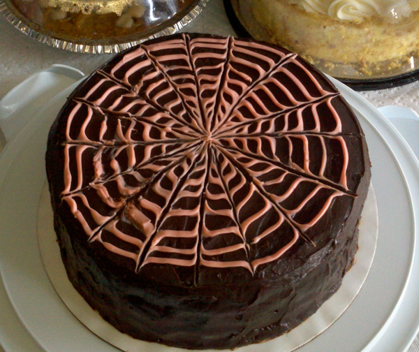 My husband volunteered me to bake a cake for a holiday party at his job. I saw this recipe on the blog Always Order Dessert and needed an excuse to make it. Now I had one. I followed the instructions on the blog for the most part, except I used Wilton icing gel to color the layers. After I covered the cake in chocolate ganache, I drew a spider web on top.